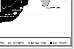 Obsolete pesticide stockpiles have been identified in every African country. This map highlights this serious problem by displaying how many tonnes of stockpiles have been inventoried in each African country. The inventories were conducted by the UN Food and Agriculture Organization.